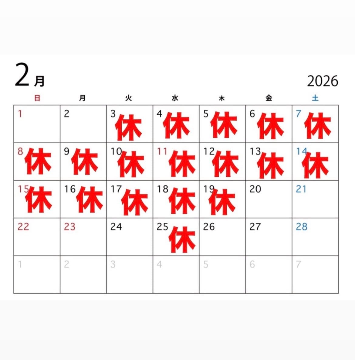 2月の店舗の営業日程となります