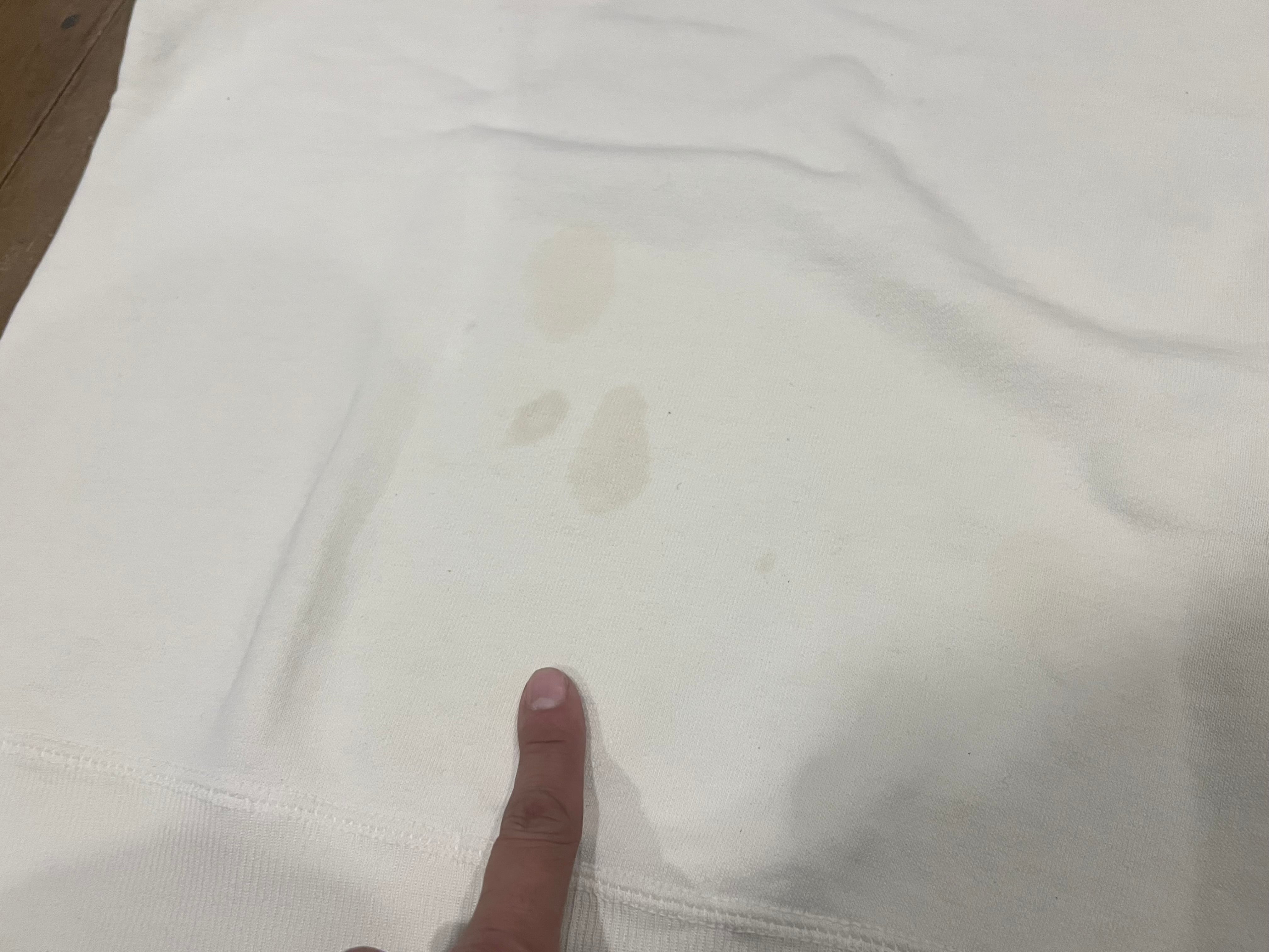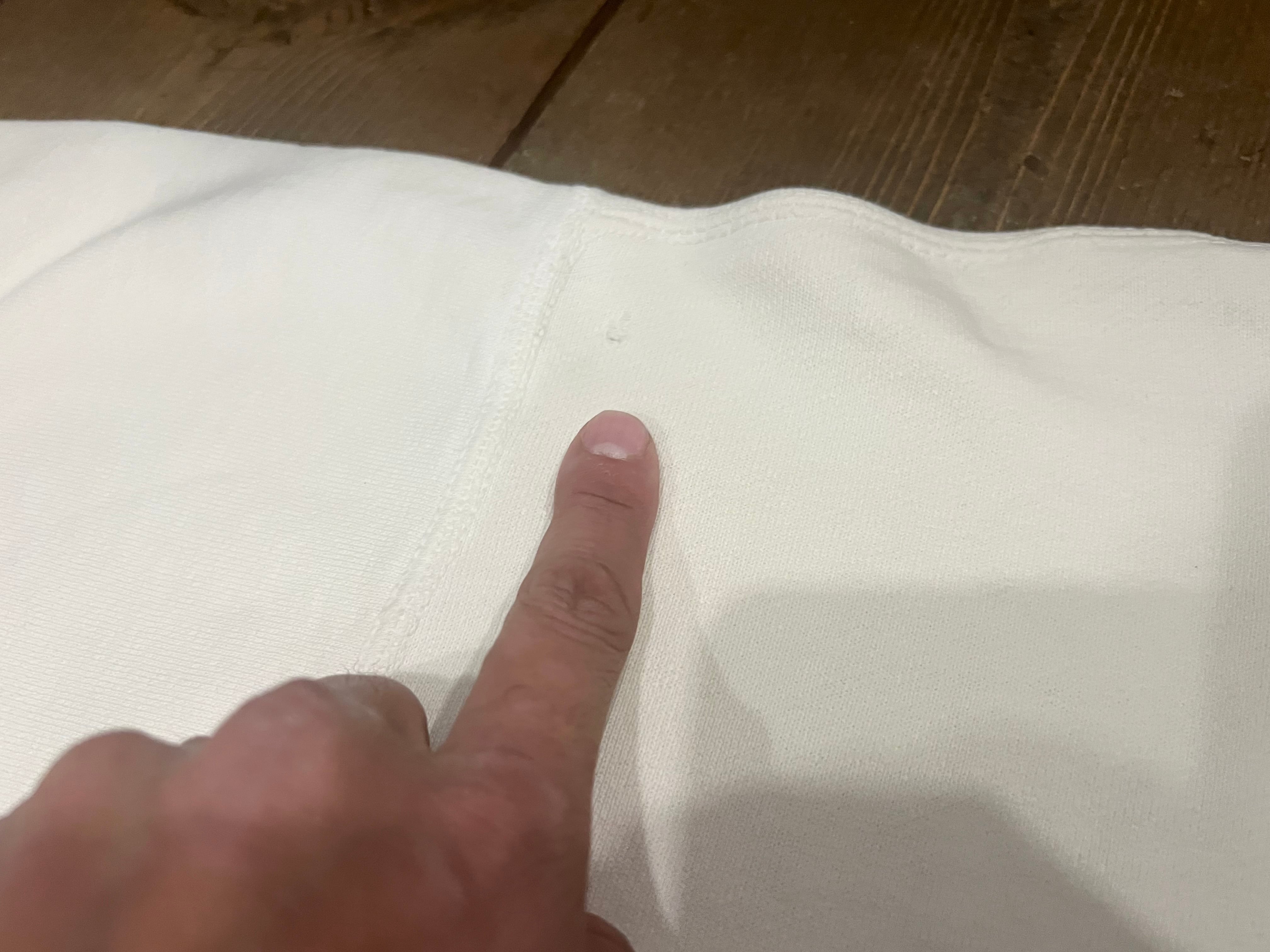 薄ら黄ばみ(袖口)、ピンホールほどの傷はありますが、意外と生地は厚みもあって良好です☺︎