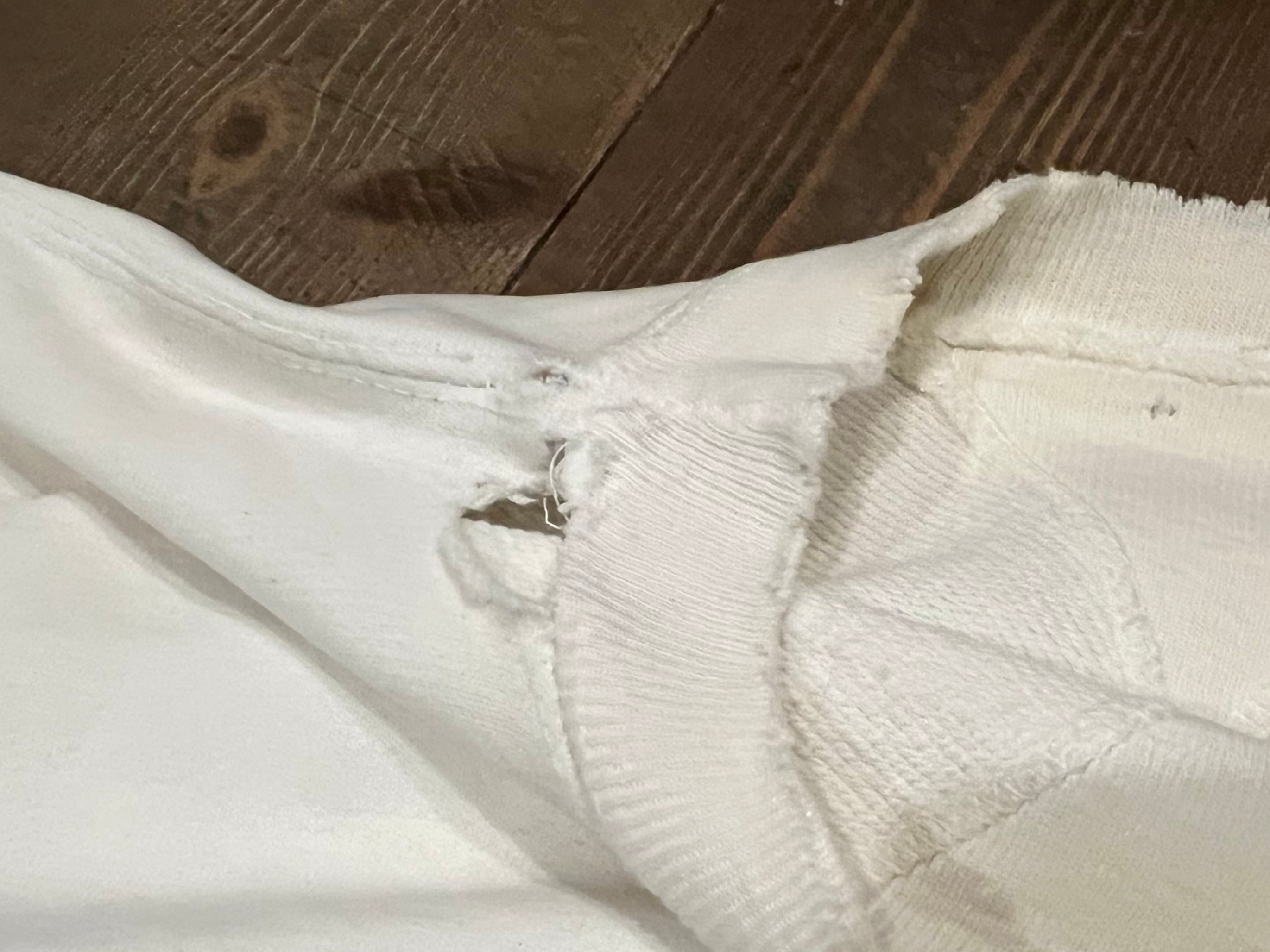 ネック横、手縫いで補修しようか迷いましたがあえてそのままです