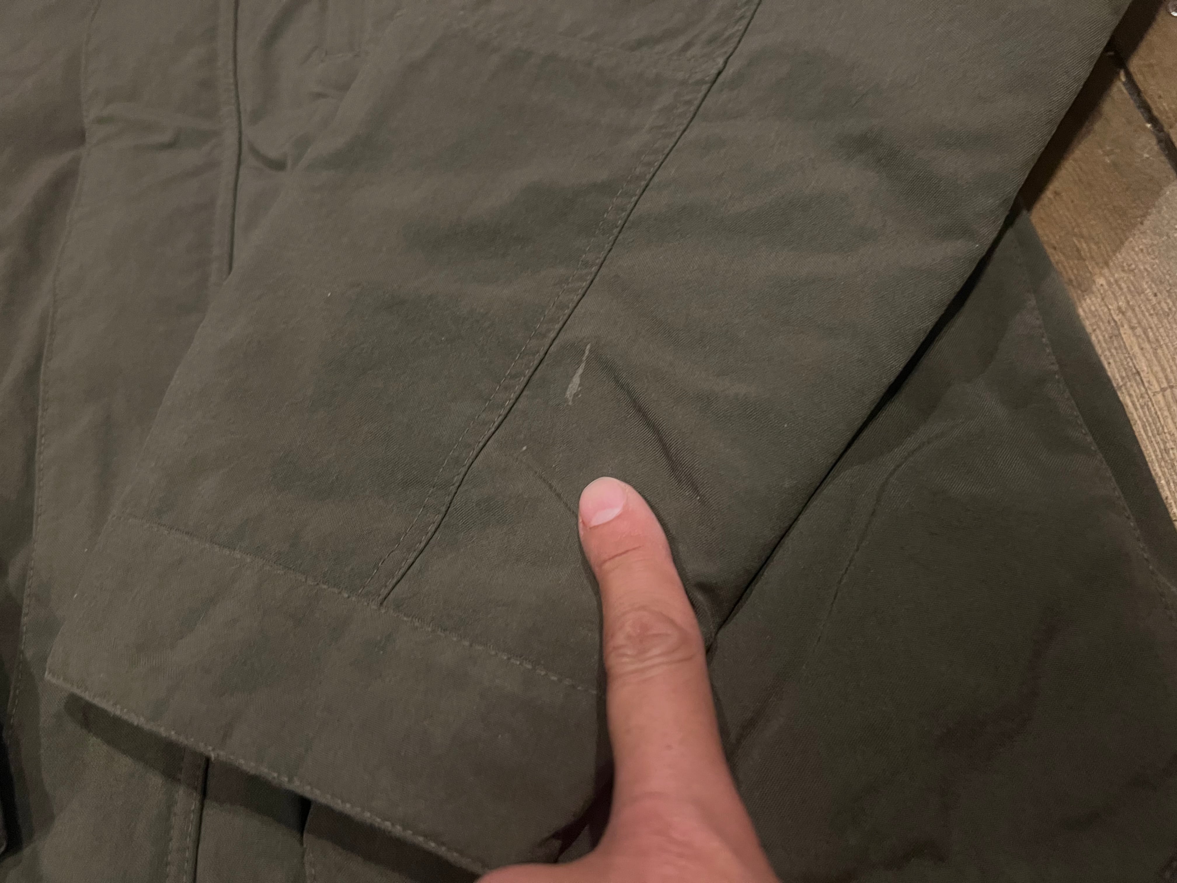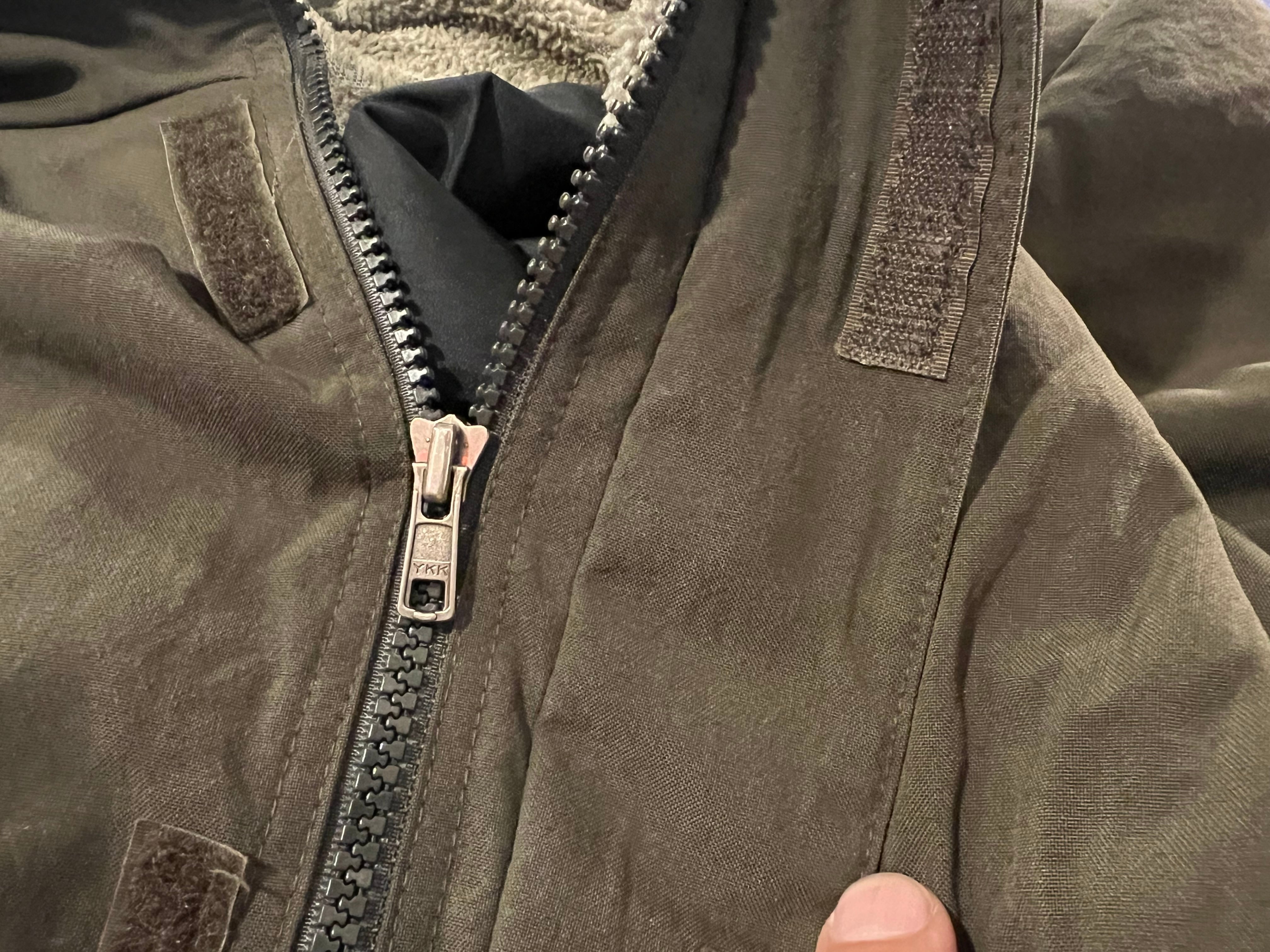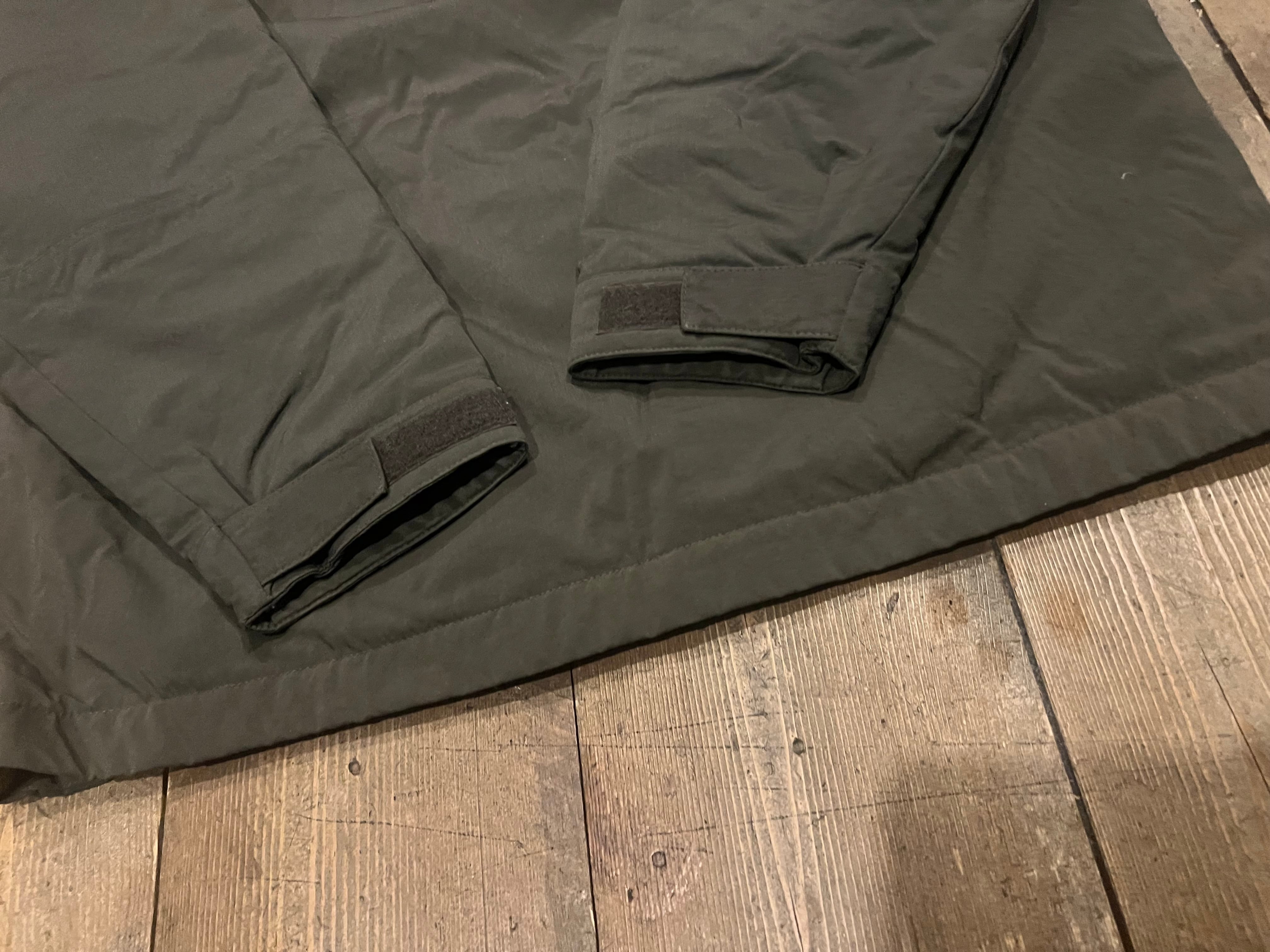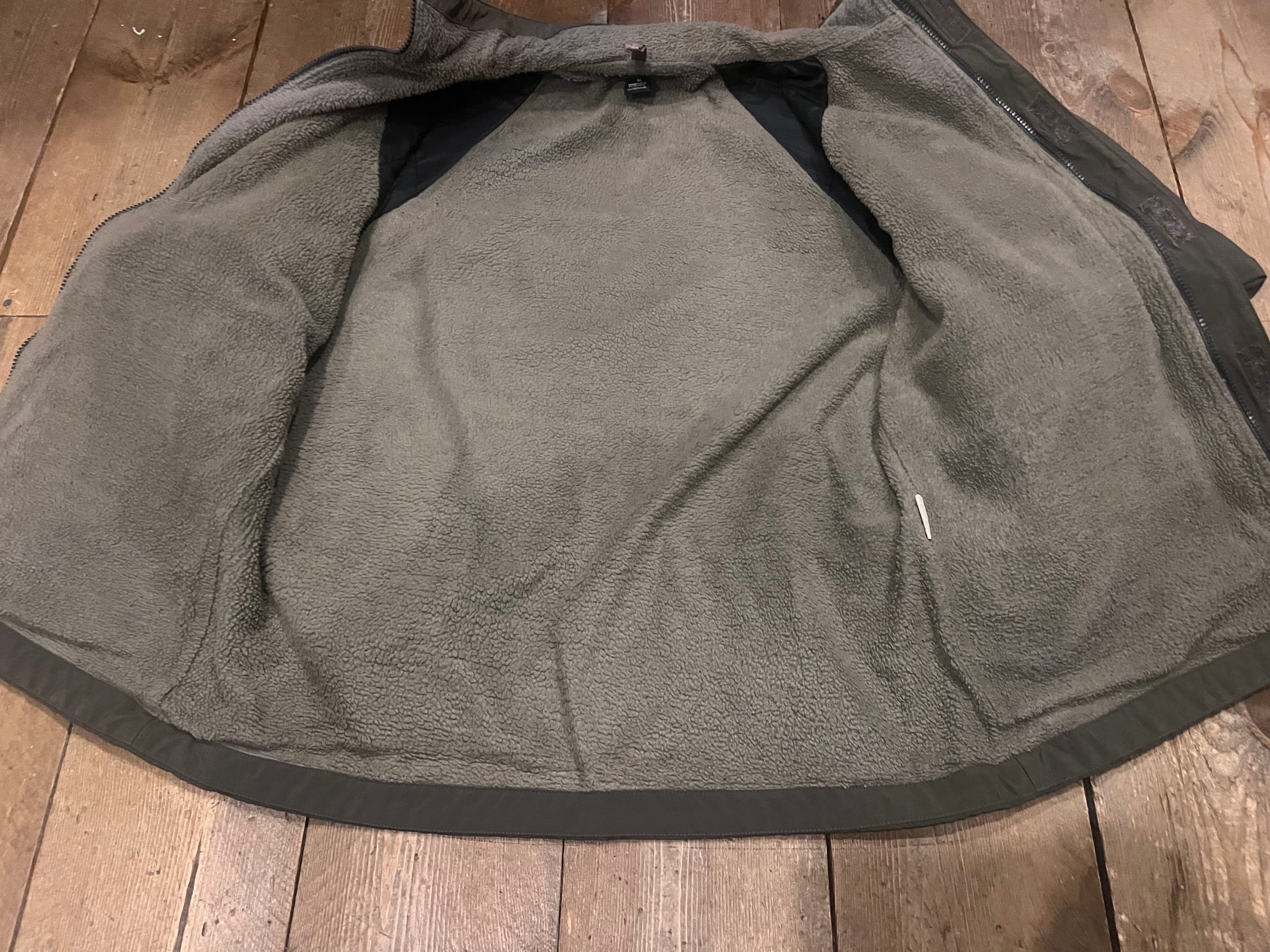 袖口辺りに僅かな汚れ、裏地のフリースの生地の折り返し部分(襟裏)の生地のスレがあります